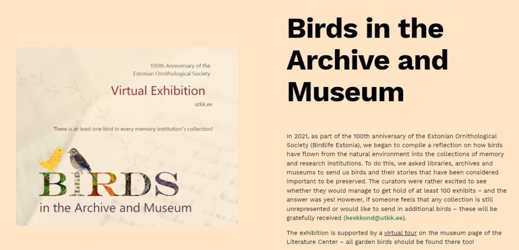 What would a museum be without exhibitions? Several points on the virtual tour open up entire virtual exhibitions, some of which are related to environmental history. You can, for example, visit the exhibition „Women Writing Birds: Pioneers of American Ornithology in the 19th Century“ on the Europeana portal. And we highly recommend the virtual exhibition „Bird in the Archive and Museum“, created collaboratively by Estonian museums and archives, curated by the Literature Center (descriptions of exhibits are only in Estonian).