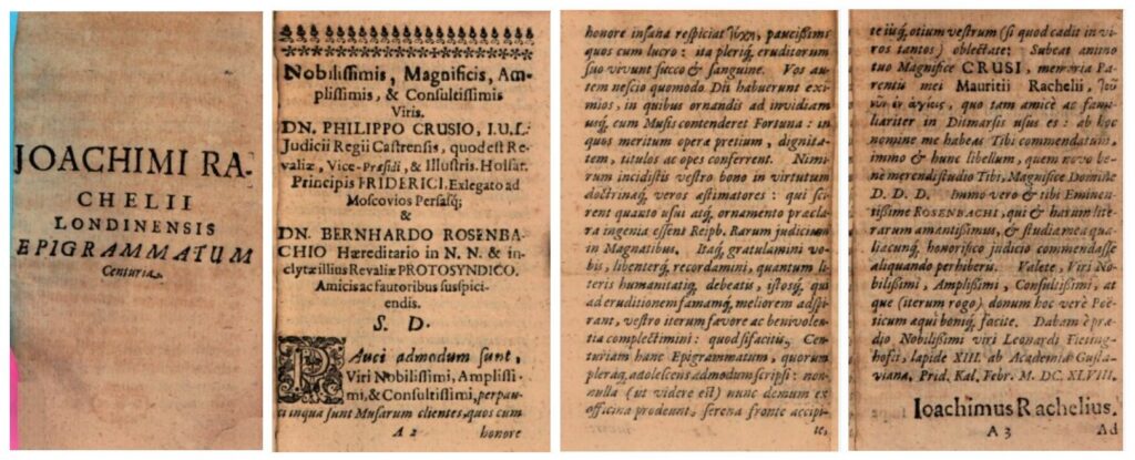 The first collection of non-occasional poems published in Tallinn – the collection of Joachim Rachel's epigrams "One Hundred Epigrams" published around 1648 – was thought to be lost. But a copy was published in the Austrian National Library a few years ago. The picture shows the title page of the collection and a foreword that says that it was made in "Viitina manor in Livonia, the 13th (mile) stone from the Academia Gustaviana".