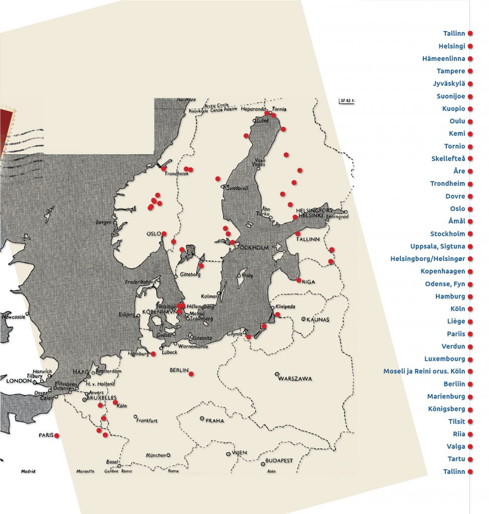 In 1931 the writers Karl Ast Rumor and Friedebert Tuglas travelled around for a month and a half in Scandinavia and Central Europe in the omnibus of entrepreneur Aleksander Puhk. At the wheel was racecar driver Heinrich Tael. Ast published a merry running travelogue of the first part of the journey in the magazine Nool [Arrow], followed by Tuglasʼ more elevated account, which has found its way into the latterʼs memoirs and collected works. There were episodes of sleeping under a tree and a luxury hotel, drinking wine from a pail, a record player blaring into the autumn night, sparks fading into the darkness and the bustle of a large city. During their travels the wanderers kept in touch with the homeland through letters; the book includes excerpts from Tuglasʼ and his wife Eloʼs correspondence, often (sweetly) dramatic and emotional. Namely, as the itinerary kept changing Elo sometimes had no idea where the wanderers had landed.