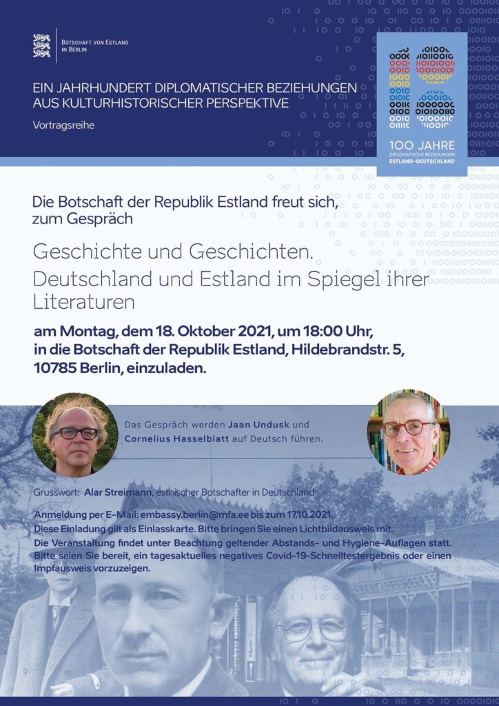 Im Rahmen der Vortragsreihe „Ein Jahrhundert diplomatischer Beziehungen aus kulturhistorischer Perspektive“ aus Anlass des 100. Jahrestages der Aufnahme der diplomatischen Beziehungen zwischen Deutschland und Estland findet am 18. Oktober 2021, um 18:00 Uhr, ein Vortrag zum Thema „Geschichte und Geschichten. Deutschland und Estland im Spiegel ihrer Literaturen“ statt.