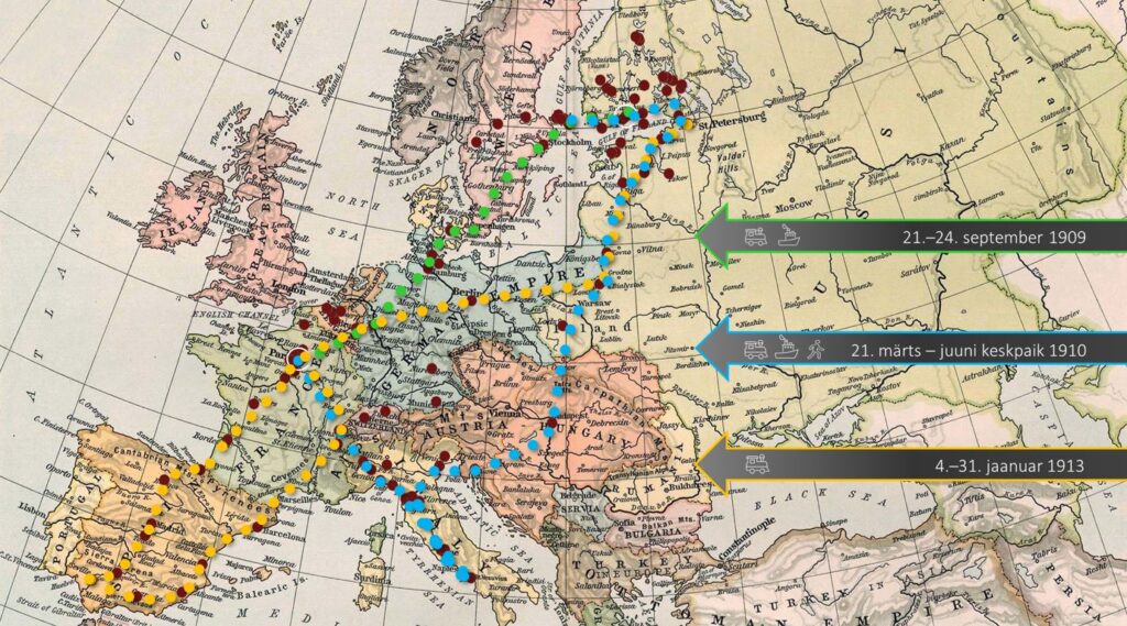 Elle-Mari Talivee, Senior Research Fellow at the Literature Centre and Marin Jänes, Research Secretary, will give a presentation titled “The travel and weather map of a political refugee from the Baltics from the early 20th Century”. The focus of the presentation is on a map application that shows the journey of Friedebert Tuglas in exile in 1906-1917 alongside the public transport network and the weather of that time. Tuglas fled Estonia for political reasons and was severely affected by the environment due to his lack of money and illegal immigrant status. He lived in Europe under seven different names and crossed the border of the tsarist state ten times with foreign documents. Tuglas mainly used the train to get around, but his notes give an overview of almost all the public transport used at the time. Tuglas’ choices were often determined by existing routes, accommodation and travel costs. In his biographical notes and letters he often writes about the weather that influenced his journey. We should therefore look at these factors together to understand the extent to which they affect such a multifaceted and complex process as forced migration.