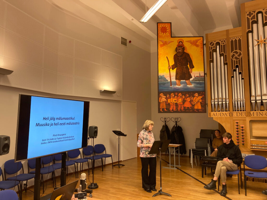 Eesti Teaduste Akadeemia Underi ja Tuglase Kirjanduskeskuse teadur Piret Kruuspere peab konverentsil ettekande „Heli jälg mälumaastikul. Muusika ja heli eesti mäluteatris“. Keskendudes kolme autori, kirjanike Rein Saluri ja Madis Kõivu ning lavastaja Merle Karusoo loomenäidetele, analüüsitakse ettekandes ühelt poolt seda, kuivõrd on muusika (rahvalikud ja ajastuomased nn esinduslaulud) ning helid (argielu- ja loodushääled) sisse kirjutatud dramaturgilistesse tekstidesse. Teisalt vaadeldakse ka seda, kas ja kuidas on muusika ja/või helid teostunud ning milliseid tähendusvarjundeid kandnud tekstide lavatõlgendustes.