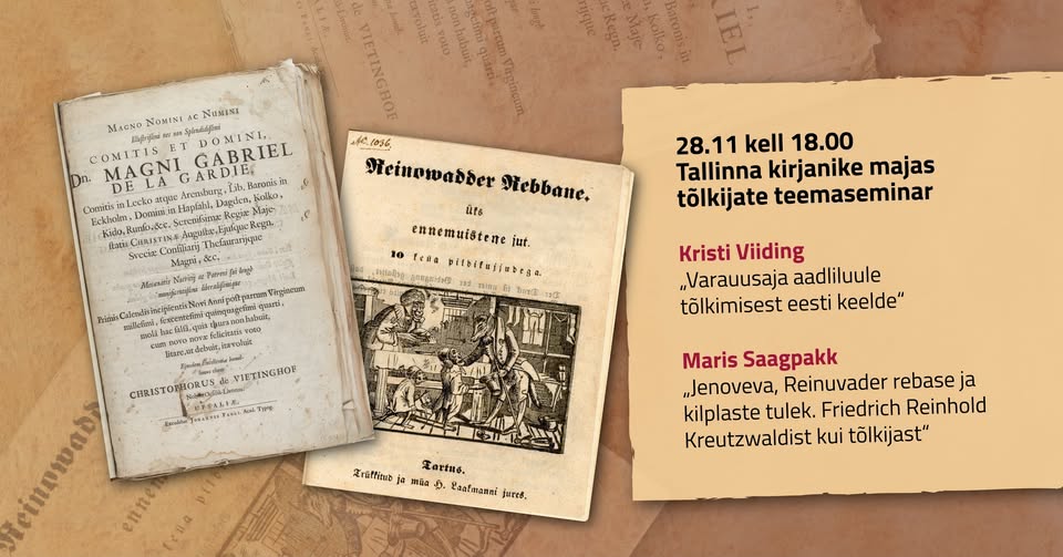 28. novembril 2025 kell 18 toimub Tallinnas, kirjanike maja Faatumi toas taas tõlkijate teemaseminar, kus seekord saab kuulda kaht ettekannet. Eesti Teaduste Akadeemia Underi ja Tuglase Kirjanduskeskuse direktor ja juhtivteadur Kristi Viiding räägib teemal „Varauusaja aadliluule tõlkimisest eesti keelde“ ning Tallinna Ülikooli dotsent ja teadur Maris Saagpakk teemal „Jenoveva, Reinuvader rebase ja kilplaste tulek. Friedrich Reinhold Kreutzwaldist kui tõlkijast“.