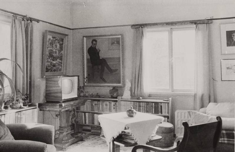 Friedebert ja Elo Tuglase elutoas jookseb mööda lõuna- ja lääneseina raamaturiiul, kus ühe sektsiooni moodustab Loomingu Raamatukogu sari.