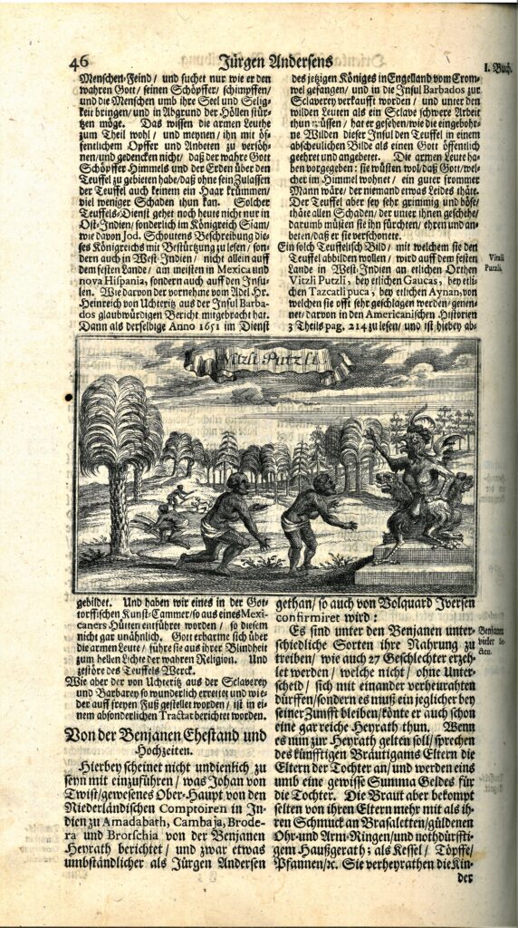 Selline ebajumal on reisikirjas paigutatud Lääne-Indiasse. Tegelikult peaks tegemist olema hoopis asteekide jumalaga Huitzilopochtli, ka Uitzilopochtli või Vitzliputzliga, kes oli sõja ja päikese jumal Tenochtitlani linnas. See jumal polnud ka kukesarnane, vaid teda on kujutatud jaaguari peaga, mida ehivad sarved või sulepea. Vasakus käes hoiab jumalik olend kilpi ja loorberioksa, teises käes keppi. Jalgadel on kitsejalgade eeskujul lõhenenud küünised. Tagaküljel on nahkhiirelaadsed tiivad ja kõhupoolel teravaid hambaid näitav rebenenud kurguga nägu. Jürgen Andersen oma reisil Ameerikat ei külastanud.