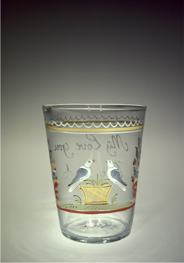 Arheoloog Monika Reppo järgi on kahe valge tuvi ja südamega joogiklaas (AI 7032: 332/11–19, 641/1) armas pilgupüüdja 18. sajandist. Tollal olid moes lihtsakoelise värvilise emailmaalinguga anumad, millel olid sageli armastuse ja meelespea motiivid. Sellel joogiklaasil on täpsemalt kujutatud rahutuvisid, mis on kaljutuvi või naeru-turteltuvi (Streptopelia roseogrisea, Streptopelia risoria) geneetilise mutatsiooniga (albinism) alaliik. Kahjuks on mõlema tuvi pead puudu.