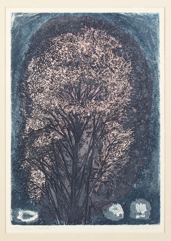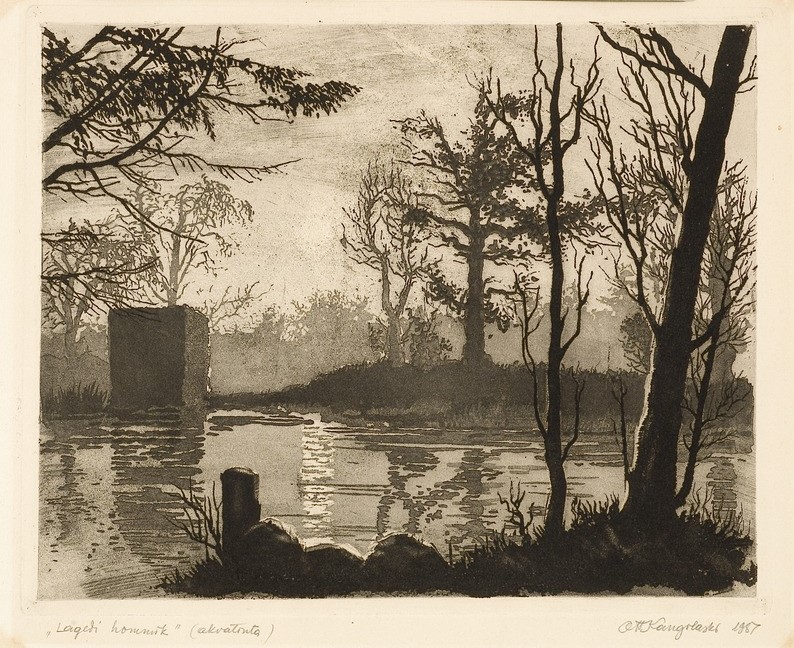 Ott Kangilaski, „Lagedi hommik“ (1957). Ott Kangilaski (1911–1975) akvatintatehnikas graafiline leht „Lagedi hommik“ on motiiv kunstniku kodupaigast, kus ta elas aastast 1948 kuni elu lõpuni. Tuglaste kodus oli sellel tööl eriline tähendus, kuna meenutas nende viibimist 15. juunil 1958. aastal Kangilaski juures Lagedil. Siis said nad sealset pererahvast, loodusest ja aiast elamuse, mille erilisust rõhutab eriti Elo oma päevikulaadsetes märkmetes, kuid ei jäta fikseerimata ka Friedebert Tuglas. On tõenäoline, et „Lagedi hommik“ jõudis Tuglaste poole just selle külastuse tagajärjel. See ei jäänud nende viimaseks külaskäiguks Lagedile. Järgmine nende märgatavam tegu toimus seal 1967. aastal, mil nad istutasid Ott Kangilaski eestvõttel rajatud Külma parki kaks tamme.