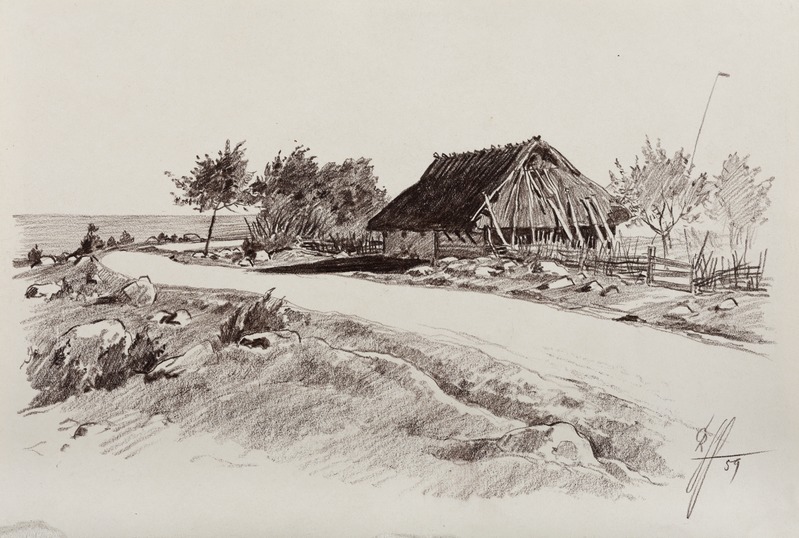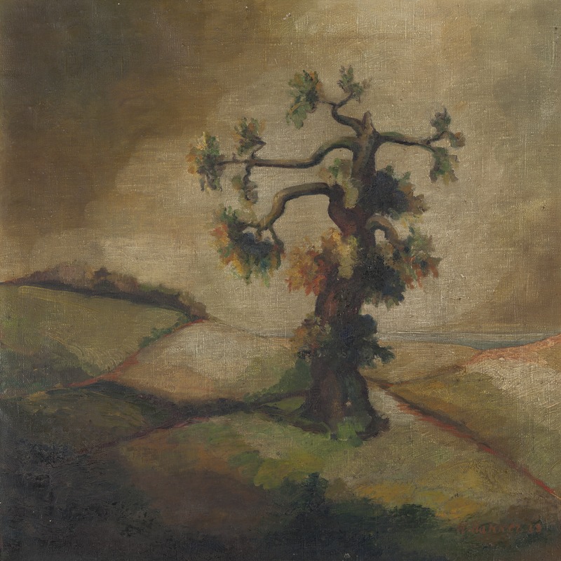 Evald Okas, „Maastik“ (1946). Evald Okase (1915–2011) 1946. aastal valminud litograafiatehnikas „Maastik“ on väga vähe levinud graafiline leht. Tegemist on kunstniku kingitusega Friedebert Tuglasele, keda ta samal 1946. aastal portreteeris. See oli Evald Okase poolt tehtud esimene portree kirjanikust, millele aastakümnete jooksul järgnes mitmeid. Seoses Tuglase luulevormis tippteose „Meri“ (loodud 1906. aastal Toompea vanglas) kirjaniku 80. sünnipäevaks editeeritud eriväljaande illustreerimisega tegi kunstnik mitu kirjanikku noorena kujutavat portreed ja valmistas talle ka esimese portree-eksliibrise. Nii portreedele kui eksliibristele tuli järg, mis tipnes 1971. aastal koos Tuglasega haiglas viibitud päevadel. Siis valminud arvukate portreeskitside alusel lõi kunstnik rea eksliibriseid ja portreid. Evald Okas külastas korduvalt Tuglaseid nende kodus, 1965. aasta külaskäigust on säilinud ka fotod, mis on jäädvustanud kunstniku ja kirjaniku viimase kabinetis.