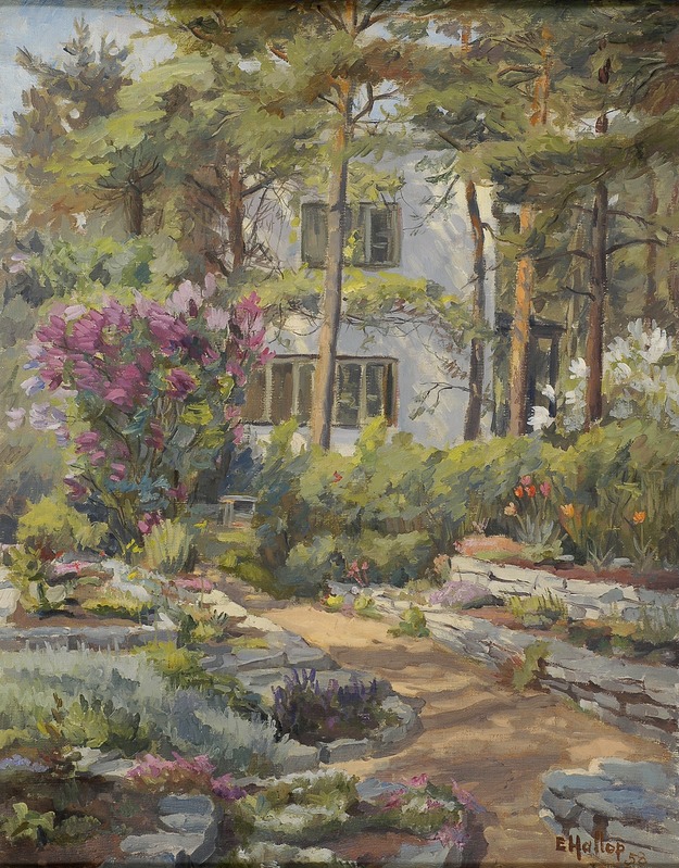 Ernst Hallop, „Tuglaste kodu“ (1958). Ernst Hallop (1908–1980) oli Tuglaste hea sõber, kelle teoseid jõudis nende majja mitmeid. Tähtsam neist on maal „Tuglase kodu“ valmimisaastaga 1958. Teos kujutab vaadet Tuglaste aiale õitseajal. Viimast nii otseses kui ka kaudsemas mõtes, sest kui toetuda Tuglase enda hinnangule 1970. aasta detsembris kirjutatud kirjas Underile ja Adsonile, siis „Umbes 10 aastat tagasi oli aed sellises hiilgeseisundis, et seda kaugemaltki vaatama sõideti. […] Kuid siis hakkas kõik alla käima, meil polnud enam jõudu ega hakkamist.“ Mis puutub maali, siis Tuglase soov oli just taolist omada ning Ernst Hallopil oli seda hõlpsam niisugusele ettepanekule vastu tulla, sest ta oli näinud kogu selle aia edenemise käekäiku 1934. aastast alates. Nimelt siis lõpetas ta koos Underi tütre Hedda Hackeriga Tartu Pallase kunstikooli ning külastas maja, kus elas tema õpingukaaslane ja kolleeg, kuni 1944. aastani.