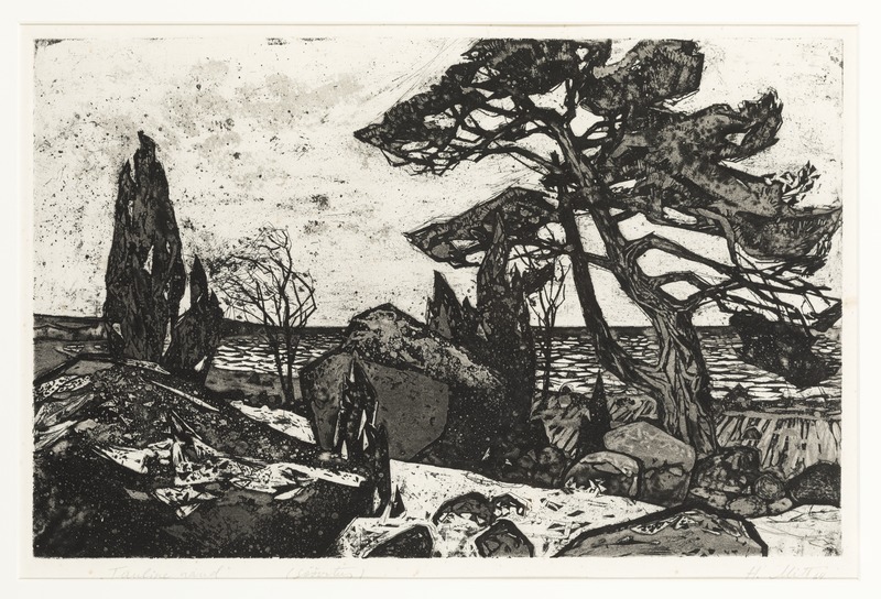 Hugo Mitt, „Tuuline rand“ (1964). Hugo Mitt (1926–1998) oli mitmekülgne kunstnik. Lõpetanud Tallinna Kunstikõrgkooli teatridekoratsiooni erialal, sai ta tuntuks eelkõige raamatuillustraatorina ja loodusvaadete graafikas jäädvustajana. Tema asjalikus laadis teostatud söövitustehnikas „Tuuline rand“ (1964) oli sedavõrd hinnatud teos, et leidis esiletõstvat äramärkimist ja reprodutseerimist 1970. aastatel ilmunud teoses „Eesti kunsti ajalugu. 2. köide. 1940–1965“. Selle graafilise lehe jõudmisest Tuglaste koju täpsemad andmed puuduvad, kuid on võimalik, et see on seotud Tuglaste kodu pideva külalise Aadu Hindiga, kelle tetraloogia „Tuuline rand“ kolm köidet olid selleks ajaks ilmunud ning viimane teoksil (ilmus 1966).
